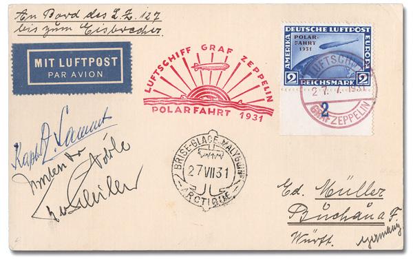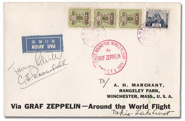 1929 (Aug 23-29), Round-the-World Flight,Tokyo to Lakehurst (Michel 31 Ea), cover franked with 3.10¥ postage and with all appropriate markings; signed by Capt. Hans von Schiller and Commander C.E. Rosendahl. Michel €750+ ($810). (Image)