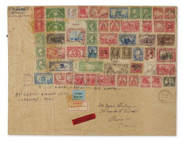 1929 (Aug. 27), Oversized, over-franked cover from Oshkosh, WI to Paris, France (Sieger 32), flown on the Lakehurst-to-Friedrichshafen return leg of the 1929 Around-the-World flight, an attention-grabbing 55-stamp franking on one of the largest Zeppelin covers we've seen (13 x 10 inches); stamps (some faulty) range from Bank Notes to Columbians to 2¢ Reds to Airmails, Special Delivery and Special Handling; all tied by numerous Oshkosh duplex cancels, endorsed "By German Airship LZ126/Lakehurst-Paris" with bilingual Airmail and French/English and German Special Delivery etiquettes on front; reverse with Friedrichshafen receiver (Sept. 4) and two "Epinal a Paris" transit (Sept. 5); philatelic and fantastic, Fine to Very Fine. (Image)