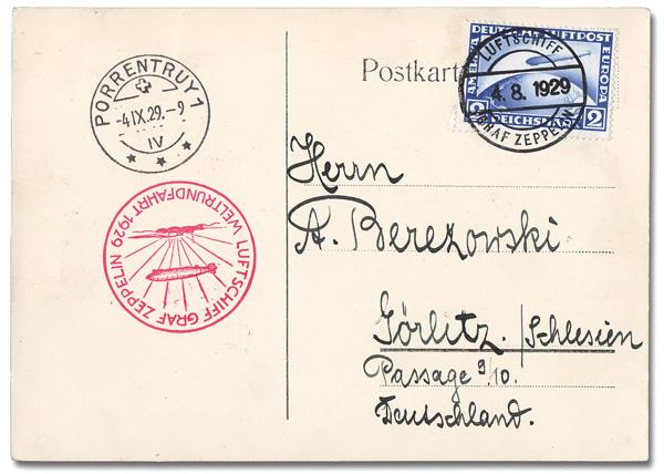 1929 (Sep 1-Sep 4), Round-the-World Flights, Lakehurst to Friedrichshafen, Porrentruy, Switzerland Drop (Michel 32 f Ia), card franked with a 2m Zeppelin (C36) tied by an Aug 4 [incorrect month] onboard cancel, with red flight cachet and clear Porrentuy receiver, Very Fine and rare. Only three covers and 22 cards were dropped. Michel €2,200 ($2,380). (Image)