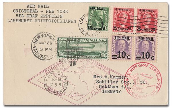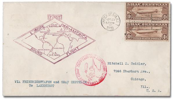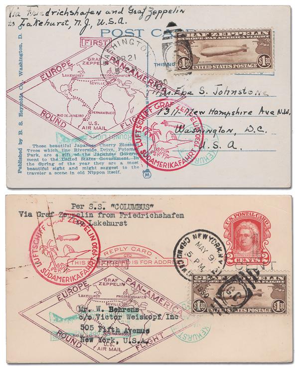 1930 South America Flight, Eight cards/covers franked with U.S. Zeppelins, two cards flown Friedrichshafen-Lakehurst, each with a $1.30 Zeppelin; and two cards & four covers flown Lakehurst-Friedrichshafen, the cards with 65¢ Zeppelins, the covers with $1.30 Zeppelins (one with a plate no. single); condition, other than one cover with a small edge tear and a slightly faulty $1.30 Zeppelin, is clean and F-VF. Scott $2,570. (PDF for this Lot) (Image)