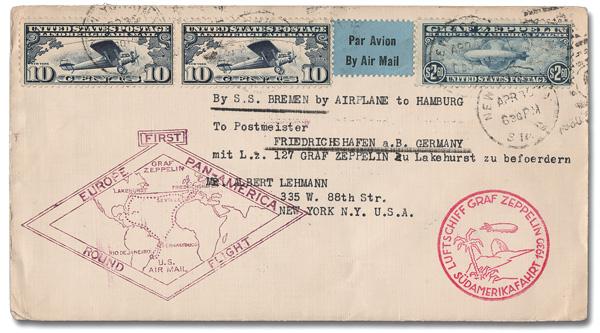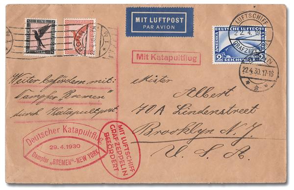 1930 (May 18-31), South America Flight, "Bremen" Catapult Flight to Hamburg, then Friedrichshafen to Lakehurst (Michel 66 H var.), cover franked with two 10¢ Lindburgh Airmails and a $2.60 Zeppelin (C10, C15) tied by Apr 30 New York duplex handstamps, with both Zeppelin flight cachets on the front and the Catapult markings and Lakehurst receiver on the reverse. Michel lists this cover only with the Bremen Catapult flight of Jun 15 at €1,000. Graue-Leder K18 X1; $2,000.