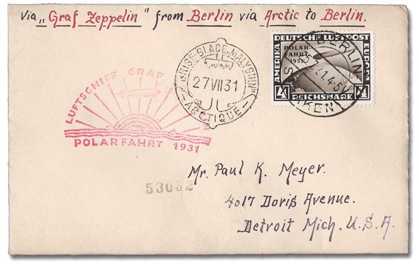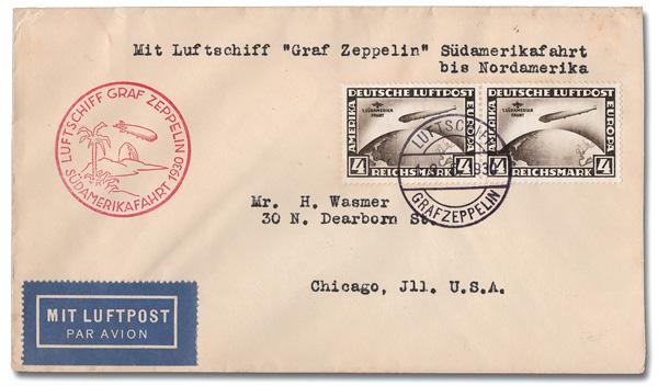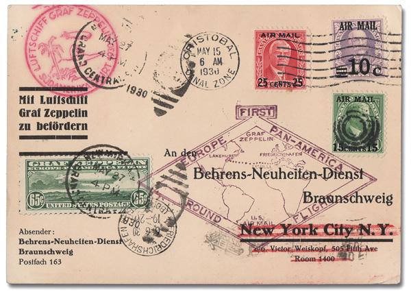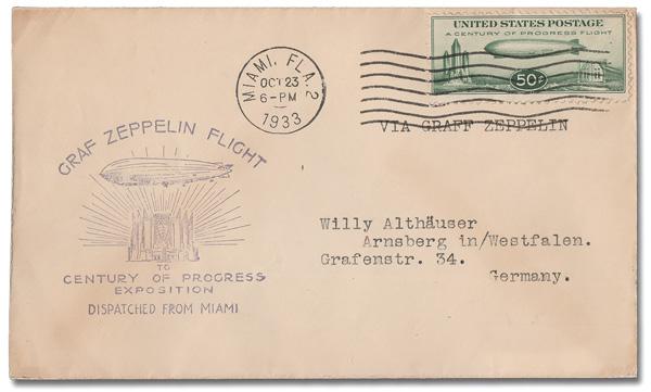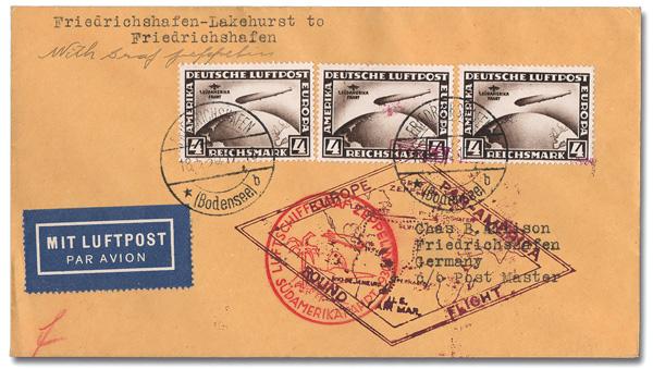 1933 (Oct 14-Nov 2), Chicago Flight, Round Trip: Friedrichshafen-Recife-Rio de Janeiro-Miami-Akron-Friedrichshafen (Michel 347//355), large cover (about 9" x 6") with frankings from Germany (3: onboard cancel of Oct 14, 19 & 25, including two 1m and a 2m South America Flight Zeppelin); Pernambuco (2: Oct 17 & 20, 8 stamps totaling 5,300r); Miami (a 50¢ #570 canceled Oct 23); and Akron (a 50¢ Zeppelin, C18, canceled Oct 25); with all appropriate cachets and datestamps, including the Nov 2 Friedrichshafen Zeppelin receiver, Very Fine and rare. Sieger 239 E. Sieger €8,000 ($8,640).