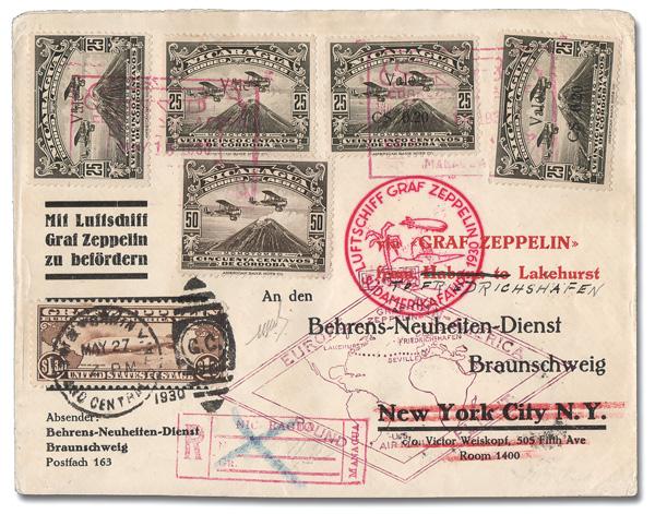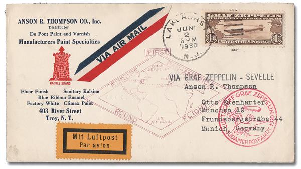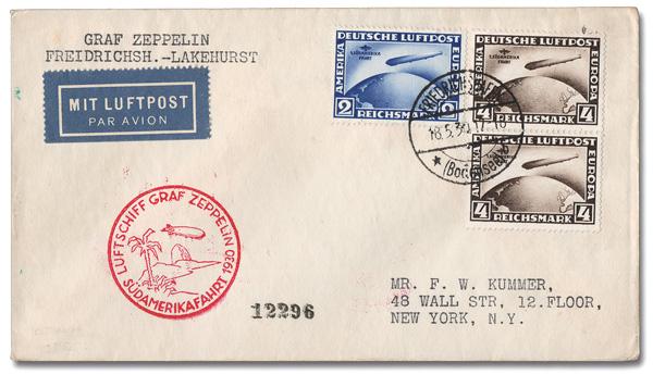 1930 (May 18-31), South America Flight, Friedrichshafen to Lakehurst (Michel 66 a), cover franked with a 2m & two 4m Zeppelins (C38-C39) tied by a May 18 Friedrichshafen c.d.s. and backstamped Lakehurst, May 31, Very Fine. Scott $975. Michel €1,500 ($1,620). (Image)