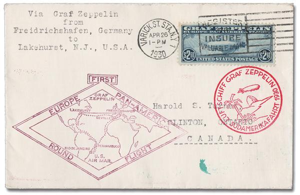 1930 (May 18-31), South America Flight, Friedrichshafen to Lakehurst (Michel 66 H c), dual-cacheted cover franked with a $2.60 Zeppelin (C15), tied by an Apr 26 New York slogan cancel with Lakehurst and Clinton, Ont., Canada backstamps, Very Fine. Michel €725 ($780). (Image)