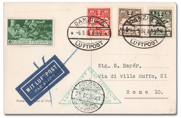 1933 (May 29), Italy Flight, Rome - Rome (Michel 303 C a), picture postcard franked with 45c postage tied by May 27 Vatican c.d.s.s along with an Italian 3L Zeppelin tied by a May 29 Rome c.d.s.; backstamped with the Rome Zeppelin receiver; picture side with a small abrasion, otherwise Very Fine. Michel €700 ($760). (Image)