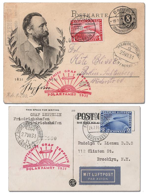 1933 (May 29), Italy Flight, Rome - Friedrichshafen Return (Michel 303 F), matched card and cover, the card franked with a 15L Zeppelin and an Italian Colonies 2.75L Pictorial (Scott 29) canceled by one of two May 27 Bengaz c.d.s.s, addressed to Brooklyn, N.Y. with no further postal markings;; the cover is similarly franked and postmarked, except with a 12L Zeppelin instead of a 15L and address to Pernambuco; each bears the identical manuscript instructions for carriage from Rome to Friedrichshafen. Both bear enough postage to be carried to their addressed destinations, but, apparently, neither made the trip., Very Fine. A curious pair.(Image)