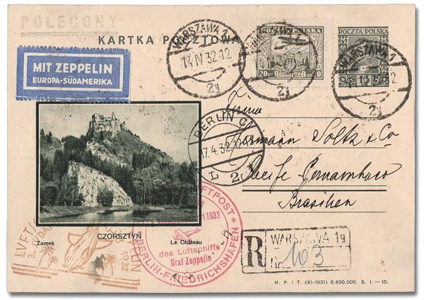 1932 (Apr 17-20), 3rd South America Flight, Friedrichshafen to Recife (Michel 239 b), plain card franked with 3.35gr postage tied by Jun 12 Warsaw c.d.s.s with Berlin connecting flight and Zeppelin cachets, Very Fine. Michel €450 ($490). (Image)