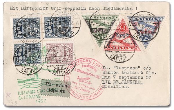 1932 (Sep 12-15), 6th South America Flight, Friedrichshafen to Pernambuco (Michel 275 b), cover franked with 1.95L postage including CB3a-CB5a, tied by Sep 9 Riga c.d.s. and by the Berlin connecting flight and Zeppelin Flight cachets, Very Fine. Michel €550 ($590). (Image)