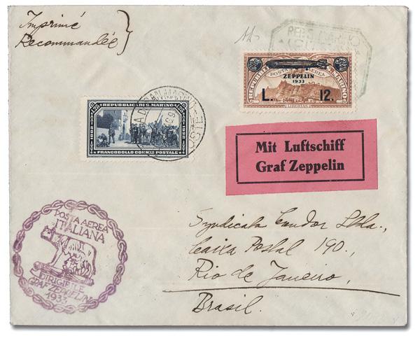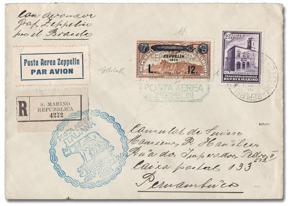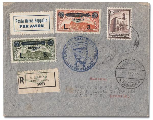 1933 (May 6-9), 1st South America Flight, Friedrichshafen to Recife (Michel 294 a), Registered cover franked with 3L & 5L Zeppelins (C11-C12) tied by green May 4 "Citta" Zeppelin datestamps and a 1.75L brown (137) tied by a normal San Marino May 4 c.d.s., with blue flight cachet, May 6 Friedrichshafen c.d.s. and Milan and Santos Brazil, backstamps, Very Fine. Michel €1,000+ ($1,080). (Image)