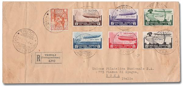 1933 (May 29), Italy Flight, Rome - Rome (Michel 303 F), registered legal size cover franked with the complete Zeppelin set (C12-C17) plus a Libia 1.75L (42) tied by May 29 Tripoli c.d.s.s; the Italian flight cachet is very faint, backstamped Rome Zeppelin c.d.s. on May 30 and registered mail c.d.s. the next day; also bears two labels for the 6th Tripoli International Fair on the reverse; vertical file fold at the left end, not affecting stamps, Fine to Very Fine, signed En. Diena, with his 1988 certificate. Michel €1,800 ($1,940). (Image)