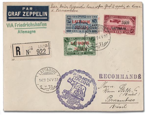1933 (May 29), Italy Flight/ 2nd South America Flight, Rome - Friedrichshafen - Pernambuco (Michel 304 A c), Registered cover franked with 108½pi tied by one of two May 24 Latakia c.d.s.s with Italian flight cachet and Beirut, Rome, abd Pernambuco backstamps, Very Fine, with a 2012 Leder/A.I.E.P. certificate. Michel €5,500 ($5,940). (Image)