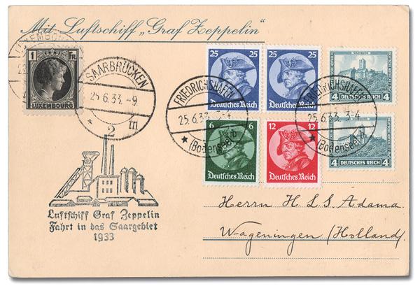 1933 (Jun 25), Saar Flight, Friedrichshafen to Saarbrüchen (Michel 312), plain card franked with a 1fr black canceled Jun 22 and German stamps totaling 76pf - including complete Frederick the Great set (2x 25pf) - tied by Jun 25 Friedrichshafen c.d.s.s, with flight cachet and Saarbrüchen receiver, Very Fine. Michel €500 ($540). (Image)
