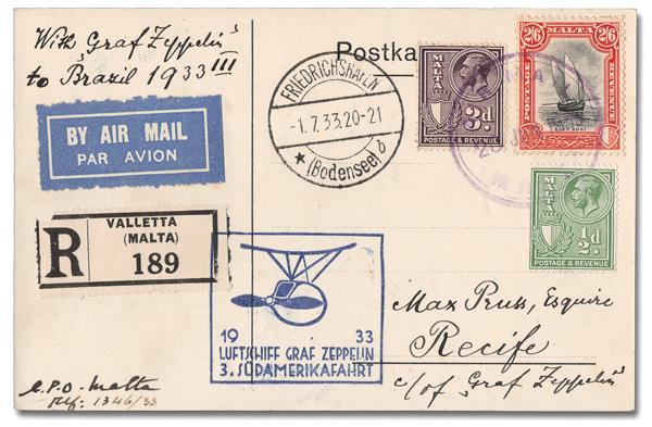 1933 (Jul 1-4), 9th South America Flight, Friedrichshafen to Recife (Michel 315 a), plain card franked with 2s9½d postage (Registered) tied by a Jun 20 Malta Air Mail c.d.s. with all appropriate markings, Very Fine. Michel €500 ($540). (Image)