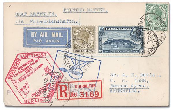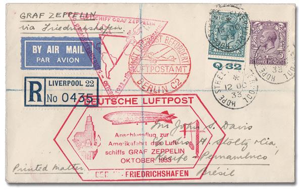1933 (Oct 14-17), Chicago Flight, Friedrichshafen to Pernambuco (Michel 347 b), Registered cover franked with 1s1d postage tied by Oct 12 Liverpool c.d.s. with Berlin connecting flight cachet and all appropriate markings, Very Fine. Michel €620 ($670). (Image)