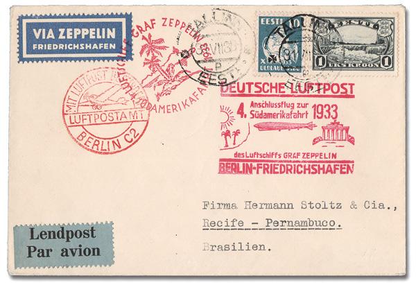 1933 (Aug 5-8), 4th South America Flight (Michel 323 b), cover franked with 1.40k postage tied by Jul 31 Tallinn c.d.s.s, with Berlin connecting flight cachet and all appropriate markings, Very Fine. Michel €480 ($520). (Image)