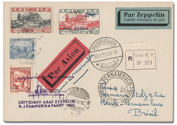 1933 (Sep 30-Oct 3), 4th South America Flight, Friedrichshafen to Recife (Michel 343 a), Registered cover franked with 12.40fr postage tied by Sep 29 Tunis c.d.s.s with all appropriate markings, Very Fine. Michel €600 ($650). (Image)