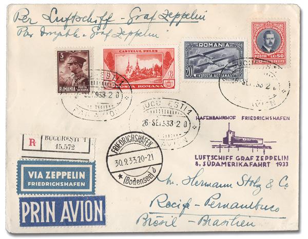 1933 (Sep 30-Oct 3), 4th South America Flight, Friedrichshafen to Recife (Michel 343 a), Registered cover franked with 81L postage tied by Sep 26 Bucharest ovals with all appropriate markings, Very Fine. Michel €450 ($490). (Image)