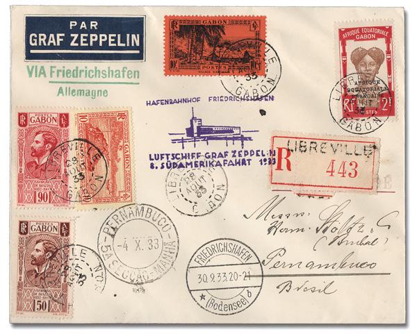 1933 (Sep 30-Oct 3), 4th South America Flight, Friedrichshafen to Recife (Michel 343 a), Registered cover franked with 13.50fr postage tied by Aug 28 Libreville c.d.s.s with all appropriate markings, Very Fine and rare. Michel €1,500 ($1,620). (Image)