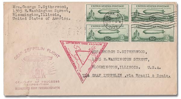 1933 (Oct 14-31), Chicago Flight, Ten different legs (Michel 347/354), all franked with 50¢ Zeppelins (C18) and all with appropriate markings (single franking unless noted): Friedrichshafen to Recife, to Rio de Janeiro, to Chicago (3 stamps), and to Seville (2nd Landing, block of 4)—these four are all New York FDCs; Miami to Akron and to Chicago; Akron to Seville; and Chicago to Akron, to Seville and to Friedrichshafen. Michel €2,330 ($2,520). (PDF for this Lot) (Image)