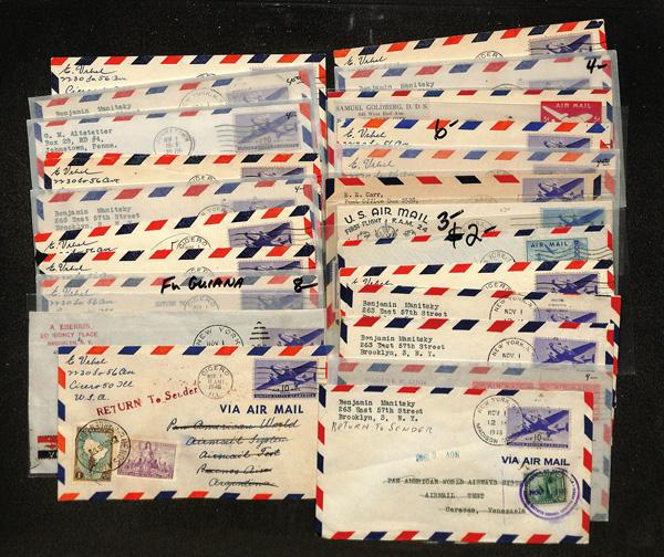 Pan Am Experimental Flights Cover Collection, 1946, 23 mixed-franking envelopes to countries including Venezuela, Bolivia, Suriname, Antigua, Brazil, British Guiana, Costa Rica, Argentina, Ecuador, El Salvador, Guatemala, Honduras, Curacao, Nicaragua, Trinidad, and Uruguay, Fine to Very Fine. (PDF for this Lot) (Image)