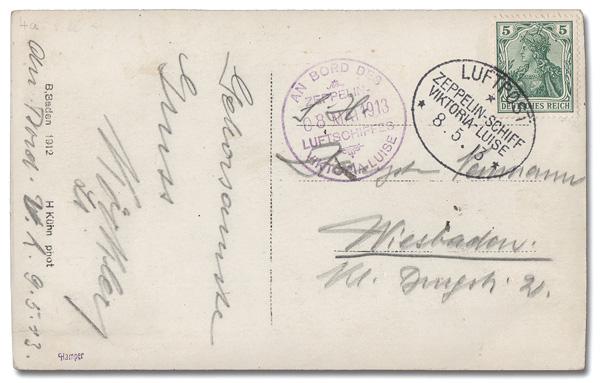 1913 (May 5) Viktoria Luise Passenger Flight (Sieger 4 a), Zeppelin photo card (Shadow of Airship over Baden-Baden) franked with a 5pf Germania with both onboard datestamps, Very Fine. Sieger €700 ($760). (Image)