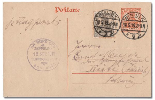 1919 (Sep 18), Bodensee Passenger Flight (Sieger 19 A), 7½pf postal card with additional 2½pf Germania tied by Berlin c.d.s.s; clear dated Bodensee onboard postmark, Very Fine. Michel 120 Ac; €500 ($540). Sieger €900 ($970). (Image)