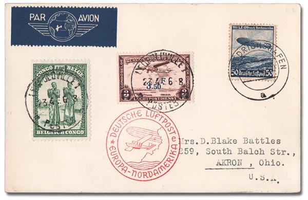 1936 First North America Flight, Friedrichshafen-Lakehurst (Sieger 406 H var.), card franked with 3.40fr canceled Leopoldville, Apr 23, then carried to Brussels (basic set complete May 2), then Friedrichshafen, where a 50pf Hindenburg Airmail (57) was added and canceled May 6; red Lorch "e" flight cachet, backstamped New York on May 9, Very Fine and rare. Michel 12e; €1,500 ($1,620). (Image)