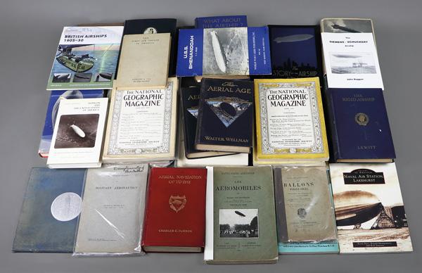 Better Airship-Related Titles, two 1st Ed copies of The Aerial Age by Walter Wellman (1911), Aerial Navigation of Today by Charles Turner (1910), My Airships by A Santos-Dumont (1904) as well as a 1973 paperback reprint, Dirigible Balloons (soft cover in French) by Gaston Tissandier (1885), The Aeromobiles (soft cover in French) by Robert Goldschmidt (1911), two copies of Story of the Airship by Hugh Allen (1931), two copies with one autographed What About the Airship by C E Rosendahl (1938), My Airship Flights 1915-1930 by George Meager (1970), ZRS-4 Ring Laying by Goodyear-Zeppelin (1929), Graf Zeppelin autographed by Gordon Vaeth (1958), Zeppelin and the United States of America by Hans Knausel (1981), The British Rigid Airship 1908-1931 by Robin Higham (1975), 1st Ed The House of Goodyear by Hugh Allen (1936), and The Rigid Airship by E H Lewitt (1925); also includes 10 editions of The National Geographic Magazine between 1918 and 1930, and a dozen British technical reports (in excellent condition). Shipping charges apply - weight 34.4 lbs. (Image)