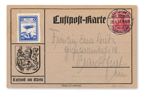 Group of Five 1912-1920 Early German Pioneer Zeppelin Flight Postal Cards, Group includes: 1913 LZ9 Rhein-Düsseldorf flight sent to Frankfurt card, 1914 LZ13 "aboard the zeppelin airship 'Hansa'" cancelled photo postcard, 1912 Wiesbaden-Frankfurt cancelled flight card, 1920 LZ120 "aboard the zeppelin airship 'Bodensee'" cancelled zeppelin launch photo postcard; Some very fresh examples and generally very fine; Fully imaged online, Fine to Very Fine. (PDF for this Lot) (Image)