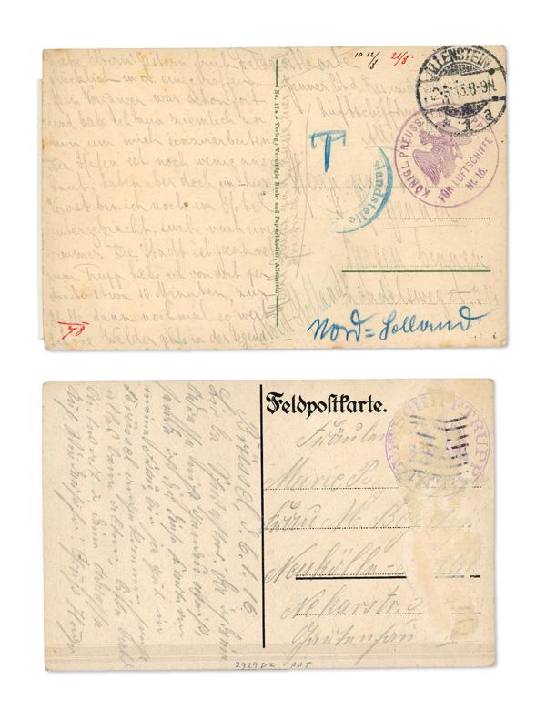 Group of Five 1915 German Marine Airship Feldpost Cards, Group includes: five feldpost cards from various German Marine Airship flights in 1915 during the First World War; Some scarce and desirable items such as a card from Luftschiffe Nr. 16 sent to a Luftschiffer's family in North Holland. (Image)