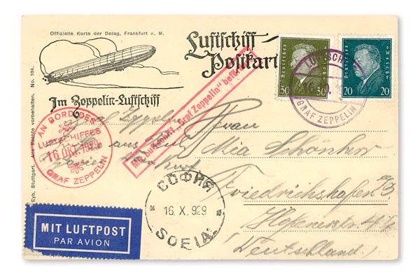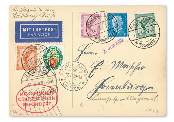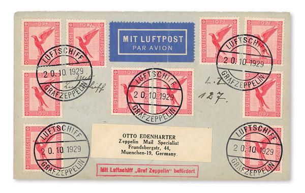 Group of Five 1929 LZ 127 Graf Zeppelin Flight Covers, Group includes: five German Graf Zeppelin flight covers with Graf Zeppelin with "Mit Luftschiff 'Graf Zeppelin' befordert" cancels; Some very fresh examples and generally very fine; Fully imaged online, Fine to Very Fine. (PDF for this Lot) (Image)