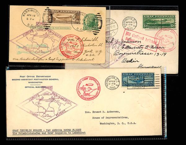 1930 (Apr. 19), South America Flight Friedrichshafen-Lakehurst First Day Cover Group (Sieger 57 F), a particularly attractive group with appropriate cancels and markings, all attractive first day covers for U.S. #C13-C15; of note is the C15 cover, which is marked "official business" from the Post Office Department, sent to famed philatelist and New Jersey State Senator Ernest R. Ackerman; Ackerman cover features a small stain below the stamp, noticeable in photos; items are all in good condition nonetheless; please see full photos online. (PDF for this Lot) (Image)