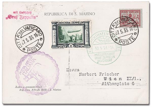 1933 Rome Flight, Rome-Friedrichshafen (Sieger 208 Va), picture postcard franked with a 75c Vatican stamp canceled May 27 and an Italian 3L Zeppelin (C42) tied by the green Friedrichshafen receiver, Very Fine. Card is an aerial view of San Marino. Michel 304C Ia; €1,500 ($1,620). (Image)