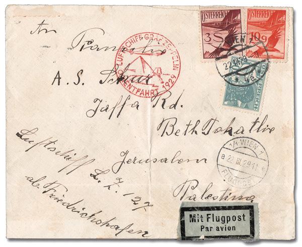 1929 Orient Flight, Friedrichshafen-Palestine Drop (Sieger 231 A var.), cover franked with 3.40s postage canceled Vienna, Mar 22; rubberstamped flight cachet, addressed to Jerusalem and backstamped (handstamped) there on Mar 27; vertical file fold and one stamp slightly damaged, otherwise Fine to Very Fine. A rare cover. Michel 18 IIh; €3,500 ($3,780). (Image)