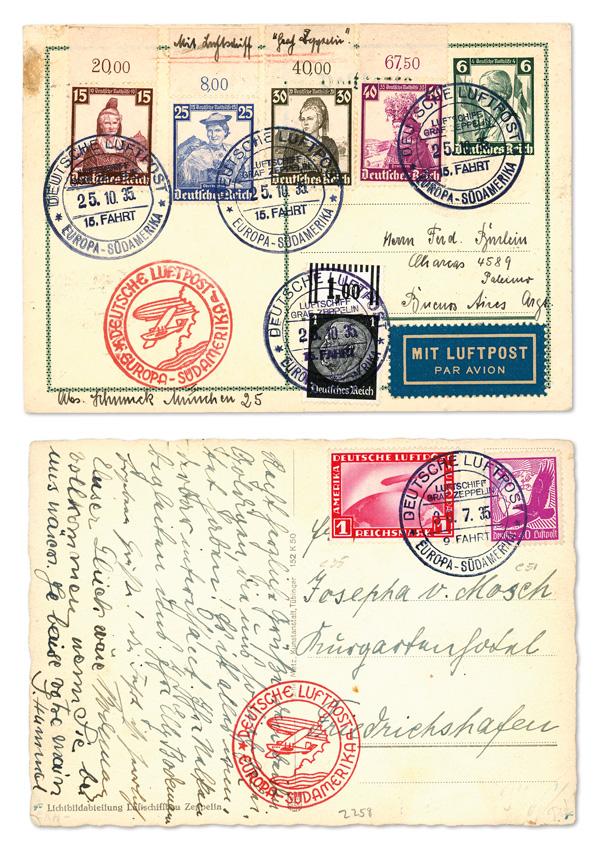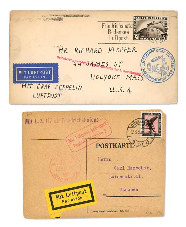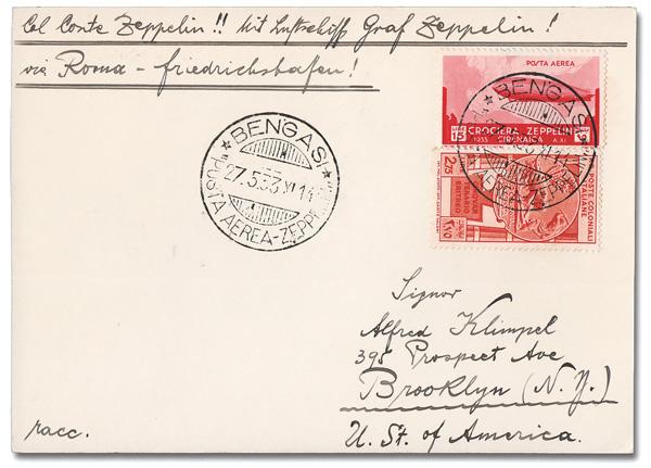 1933 (May 29), Italy Flight, Rome - Friedrichshafen Return (Michel 303 F), matched card and cover, the card franked with a 15L Zeppelin and an Italian Colonies 2.75L Pictorial (Scott 29) canceled by one of two May 27 Bengaz c.d.s.s, addressed to Brooklyn, N.Y. with no further postal markings;; the cover is similarly franked and postmarked, except with a 12L Zeppelin instead of a 15L and address to Pernambuco; each bears the identical manuscript instructions for carriage from Rome to Friedrichshafen. Both bear enough postage to be carried to their addressed destinations, but, apparently, neither made the trip., Very Fine. A curious pair.(Image)
