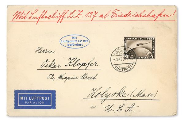 Group of Six 1928 LZ 127 Graf Zeppelin German Zeppelin Post Covers, Group includes assortment of covers all sent VIA LZ 127 Graf Zeppelin in October, 1928 to Holyoke, Mass; Some very fresh examples and generally very fine; Fully imaged online, Fine to Very Fine. (PDF for this Lot) (Image)