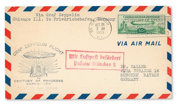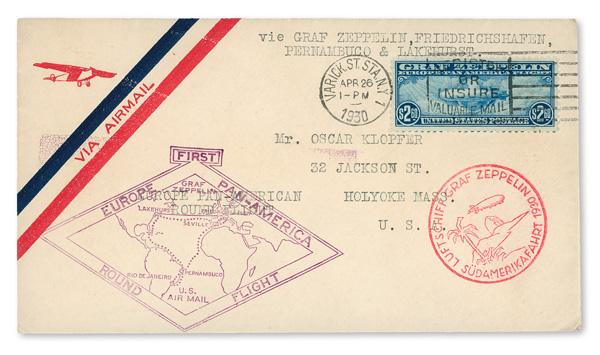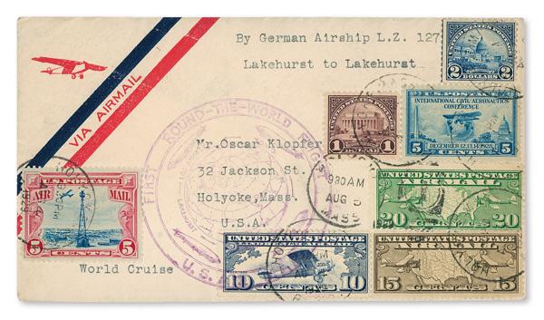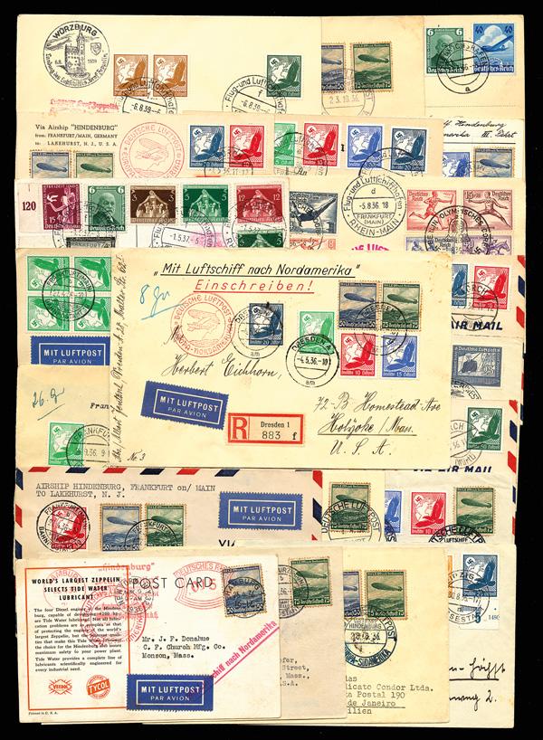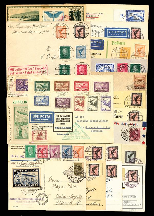 United States, Graf Zeppelin and US Airships 1930-1933, 31 envelopes and cards, of which 14 were carried by lighter than air vehicles; penny postcard uprated with #C14 enabled it to travel on the South American leg of the April 1930 flight of the Graf Zeppelin; 10 covers franked with C18 include Friedrichshafen to Miami, Friedrichshafen to Friedrichshafen, Chicago to Akron, Friedrichshafen to Rio de Janero, Chicago to Seville, Akron to Akron, Akron to Friedrichshafen, Chicago to New York, Miami to Chicago, and Miami to Akron; flown also include two maiden flights of the USS Akron (May 6), and one for the training flight (Aug 1); the others are commemorative including the Akron memorial cover autographed by three survivors; strong group, Fine to Very Fine. Shipping charges apply - weight 2 lbs. (Video for this lot) (Image)
