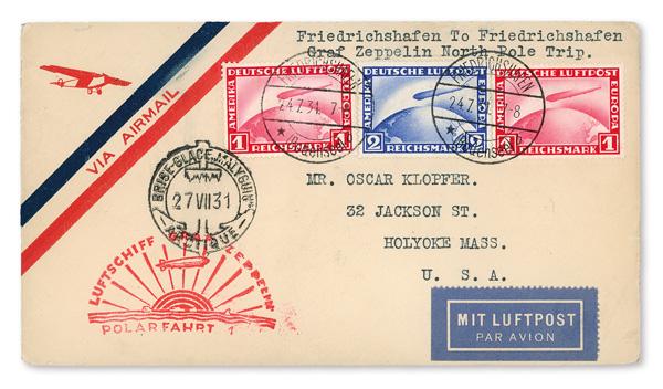 1931 (Jul 26-27), Polar Flight, Friedrichshafen to the Malyguin (Michel 204 a), cover franked with a 4m Polar Flight Zeppelin (C42) tied by a Jul 24 Friedrichshafen c.d.s. with red flight cachet and Sep 27 Malyguin c.d.s., Very Fine. Michel €775 ($840). (Image)