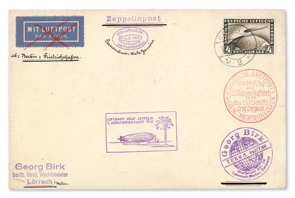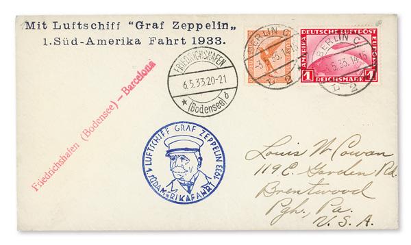 1929 Orient Flight, Friedrichshafen - Er Ramle, America Flight, Lakehurst -Friedrichshafen (Michel 18 I a, 28 a), cover franked with a 2m Zeppelin tied by a Mar 24 Friedrichshafen c.d.s. type I flight cachet plus a private Zeppelin cachet and a Mar 26 Er Ramle backstamp; the cover was then turned inside-out, and franked with $1.05 U.S. postage (including C4-C6 and an 2¢ Edison coil) tied by Aug 6 New York duplex handstamp with the American flight cachet and an Aug 10 Friedrichshafen backstamp., Very Fine and most unusual. (Image)