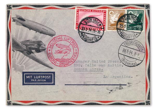 Group of Six Argentina LZ 127 Graf Zeppelin Flight Covers, Group includes: 1932 cover sent from Buenos Aires to Hamburg, 1932 very fine postcard sent from Buenos Aires to Württemberg with beautiful franking, 1931 cover sent from Buenos Aires to Friedrichshafen, 1932 postcard sent from Buenos Aires to Württemberg, 1934 cover sent from Buenos Aires to Krems, Austria, 1934 cover sent from Buenos Aires to Friedrichshafen; Some very fresh examples and generally very fine; Fully imaged online, Fine to Very Fine. (PDF for this Lot) (Image)