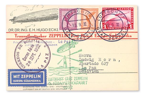 Group of Four 1932 Bolivia LZ 127 Graf Zeppelin Flight Covers, Group includes: Hugo Eckner postcard sent to La Paz, two Cochabamba postcards sent to Württemberg, Cochabamba cover sent to Braunscheweig; Very clean grouping; Some very fresh examples and generally very fine; Fully imaged online, Fine to Very Fine. (PDF for this Lot) (Image)