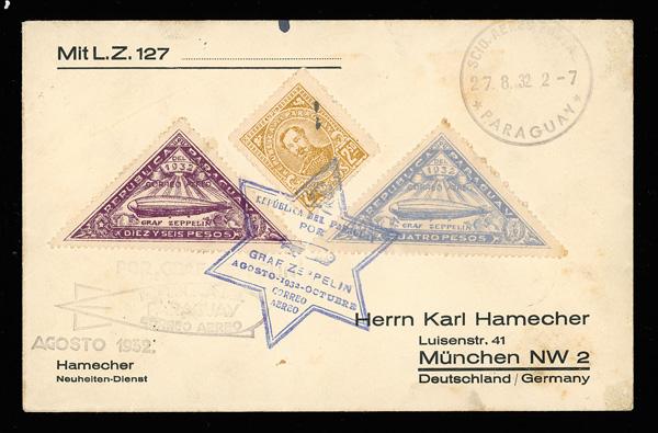 Group of Seven Paraguay LZ 127 Graf Zeppelin Flight Covers, Group includes: 1932 cover sent to Hamburg, 1932 cover sent to Munich, 1932 cover sent to Luiga 1934 cover sent to Bremen, 1935 cover sent to Kassel, 1935 cover sent to Vacha, 1935 cover sent to Burford, England; Some very fresh examples and generally very fine; Fully imaged online, Fine to Very Fine. (PDF for this Lot) (Image)