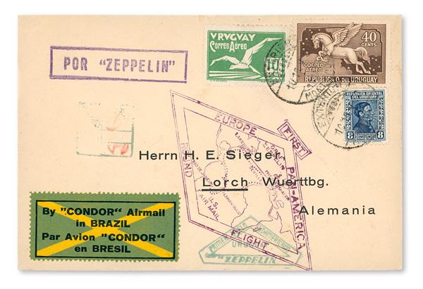 Group of Three Uruguay LZ 127 Graf Zeppelin Flight Covers, Group includes: 1932 cover sent to Württemberg, 1932 cover sent to Lorch, Württemberg, 1934 cover sent to Hamburg; Fully imaged online, Fine to Very Fine. (PDF for this Lot) (Image)