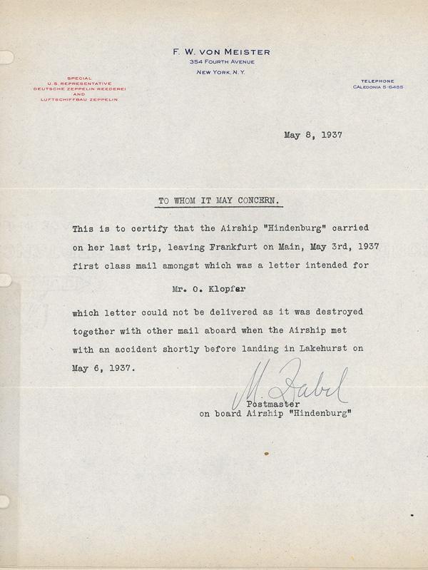 1937 (May 8) Correspondence Concerning Hindenburg Disaster Mail (Sieger 454), Max Zabel, Navigator and on board Postmaster for the Hindenburg, writes on DZR United States Representative letterhead to explain that mail intended for a "Mr. O. Klopfer" was destroyed due to the accident in New Jersey; Includes original cover; Very fine;. (Image)