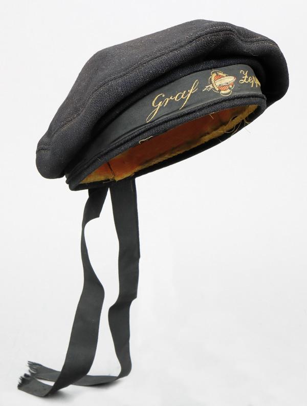 Graf Zeppelin Children's Souvenir Hat, navy blue cap in a small size with tails, perhaps for children flying aboard the dirigible Graf Zeppelin; airship's name and silhouette embroidered along headband, faux leather sweatband, well worn inside but the outside looks great; unusual piece of Zeppelin ephemera for the advanced collector. (Image)