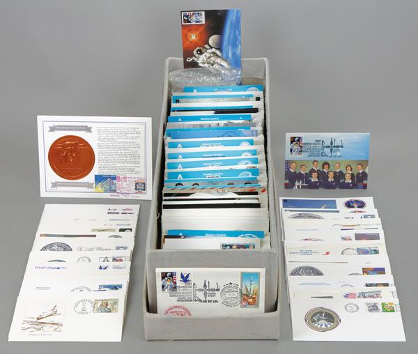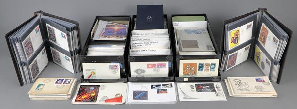 United States, To Infinity (and beyond)! 1962-2012, 3 heavy duty oversized dealer "shoe boxes" filled with space event covers; clean and neatly organized including Orbit (70), SpaceCraft (225), Rank Flocked (20), Zaso (60), Sarzin (40), Fleetwood (30), NASA Exchange (20), Lunar Voyage Cachets (60), Colorano "Silk" (300), Postal Commemorative Society (30), and numerous others; perfect for online sales, Fine to Very Fine. Shipping charges apply - weight 31 lbs. (Image)