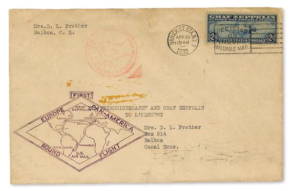 Better Zeppelin-Flown Covers, 1928-36, 23 covers and two picture postcards showing the Zeppelin in flight, addressed to either the US or Germany except #C15 to Canal Zone, one C18 to Switzerland, and one other to Czechoslovakia, each with appropriate handstamp flight cachets and flight backstamps, all US frankings include #C15, #223 & 227 & 228 on one 1933 cover & #C18 on 11 covers (Akron Oct. 4, Chicago Oct. 7, Miami Oct. 23 (4), Chicago Oct. 26 (5)), also includes one Wilkins-Ellsworth Trans-Arctic Submarine North Pole Expedition cover with TLS by Fred and John Nagel, Estella Dippold and Bert Ostberg, Very Fine, fully imaged online, ex- Richard Ellis. Shipping charges apply - weight 3 lbs. (Video for this lot) (Image)