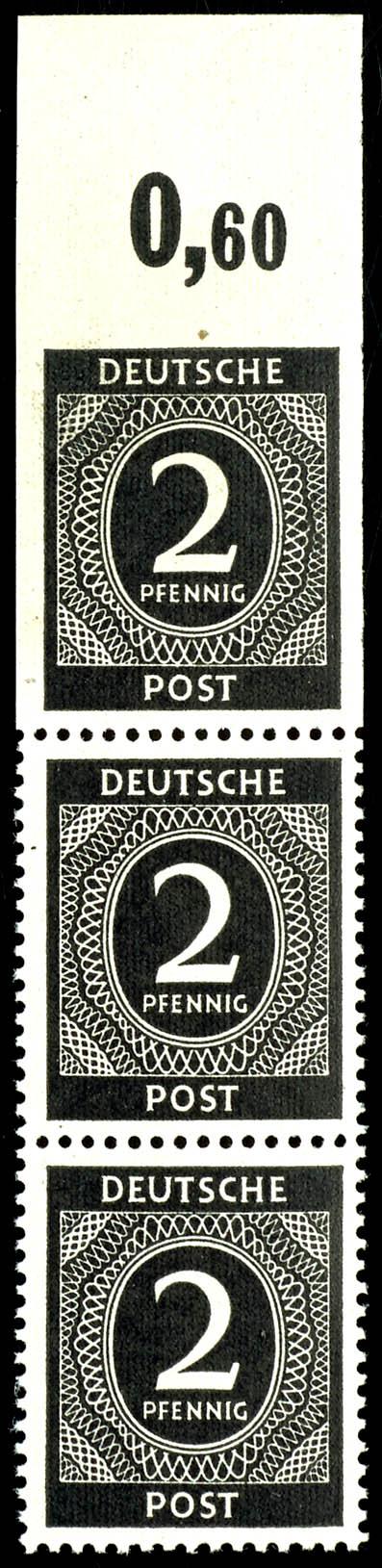3-strip of 2 Pf with a top marginal imprint, flawless, mint never hinged, the top marginal stamp only perfed at the bottom, not signed, catalog value 1000.- (91Udr) 2 Pf Ziffer Oberranddreierstreifen, tadellos, postfrisch, dabei die Oberrandmarke nur unten gezähnt, nicht signiert, Mi 1000.- (Image)