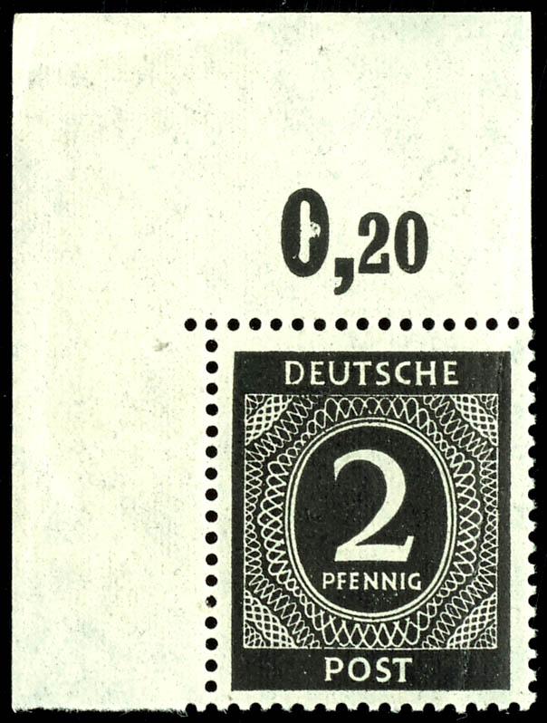 2 Pf denomination, corner piece from the left margin, flawless, mint never hinged, with an additional, vertically offset blind print, unsigned, expert opinion by Schlegel BPP, catalog value 300.- (912BD) Certificate 2 Pf Ziffer Eckrandstück li. o., tadellos, postfrisch, mit zusätzlichem nach oben versetztem Blinddruck, nicht signiert, Befund Schlegel BPP, Mi 300.- (Image)