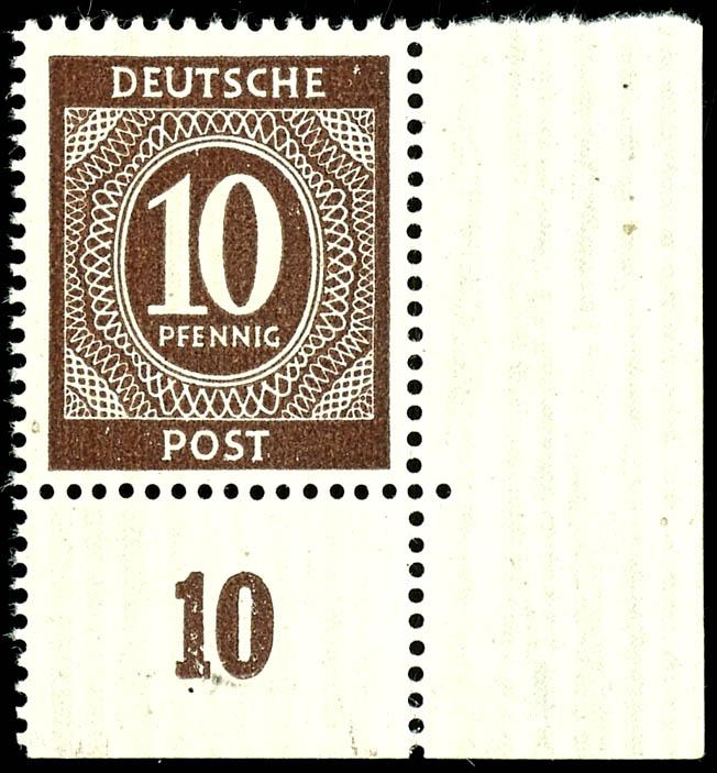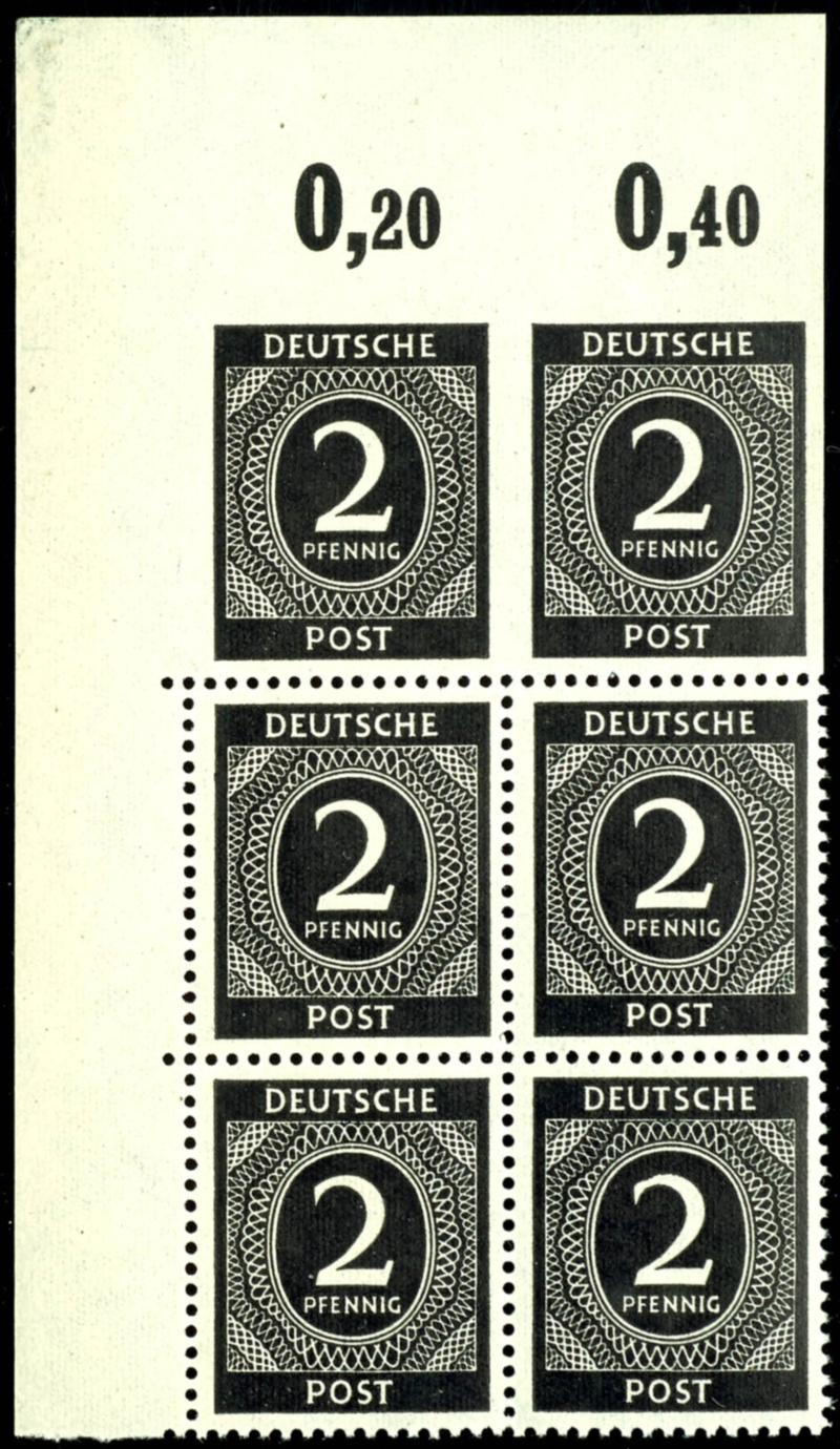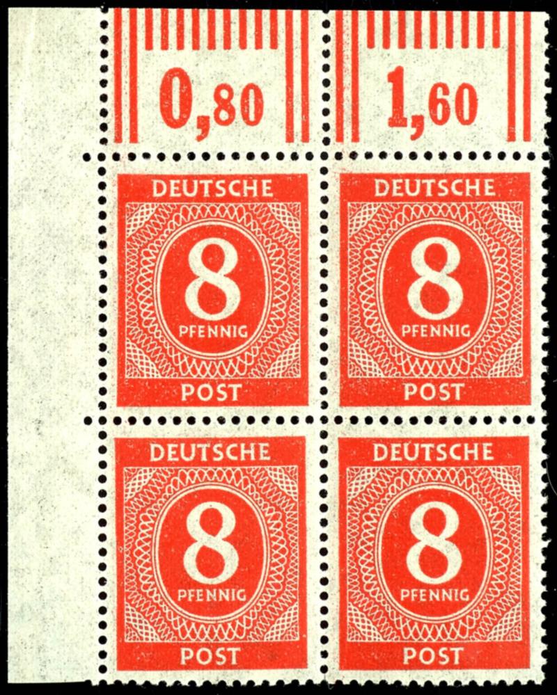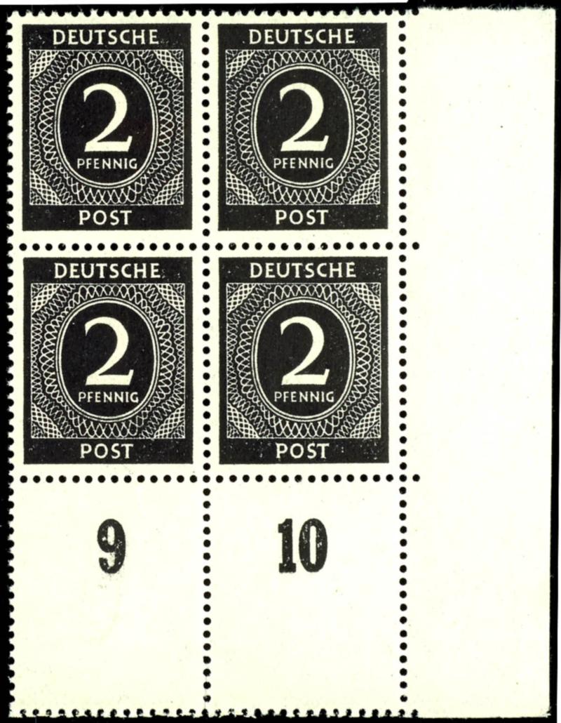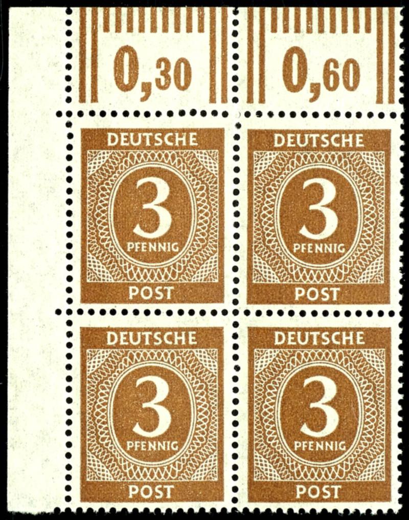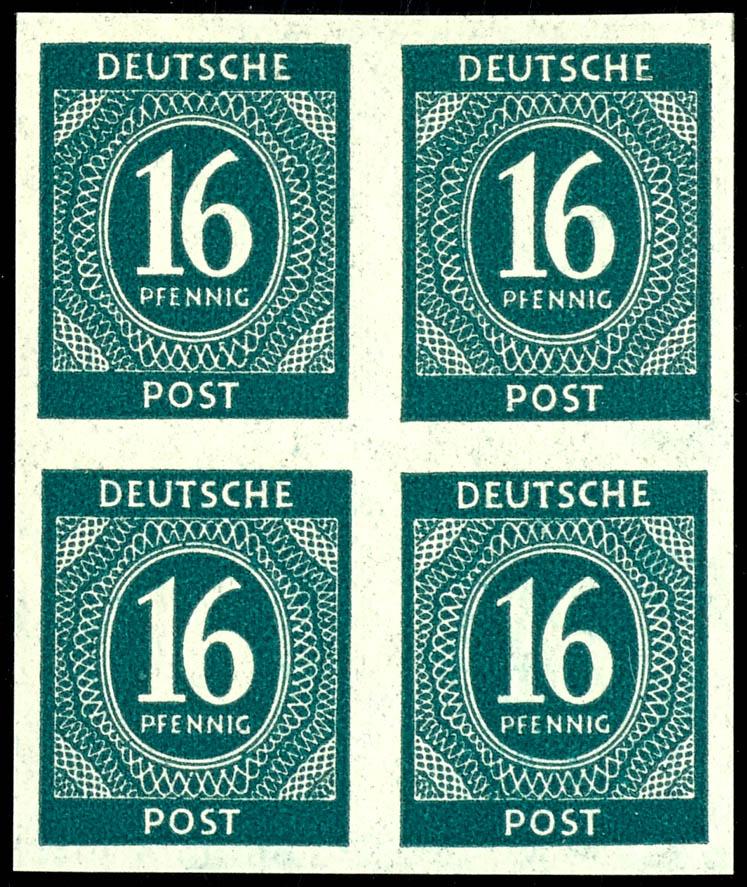16 Pf Ziffer, flawless, mint never hinged, three margin pieces in multiples, margin piece to the left, showing the perforation holes of the next sheet, sheet margin to the top, showing the row numbers of the sheet above, and in the rotary printing, to the bottom, with visible row value numbers of the subsequent sheet, unsigned. (923var) 16 Pf Ziffer, tadellos, postfrisch, drei Bogenverschnitte in Einheiten, Verschnitt nach links, so dass die Zahnlöcher des nächsten Bogens erkennbar sind, Bogenverschnitt nach oben, so dass die Reihenzähler des darüber liegenden Bogen erkennbar sind, sowie im Walzendruck nach unten, mit erkennbaren Reihenwertzählern des nachfolgenden Bogens, nicht signiert (Image)